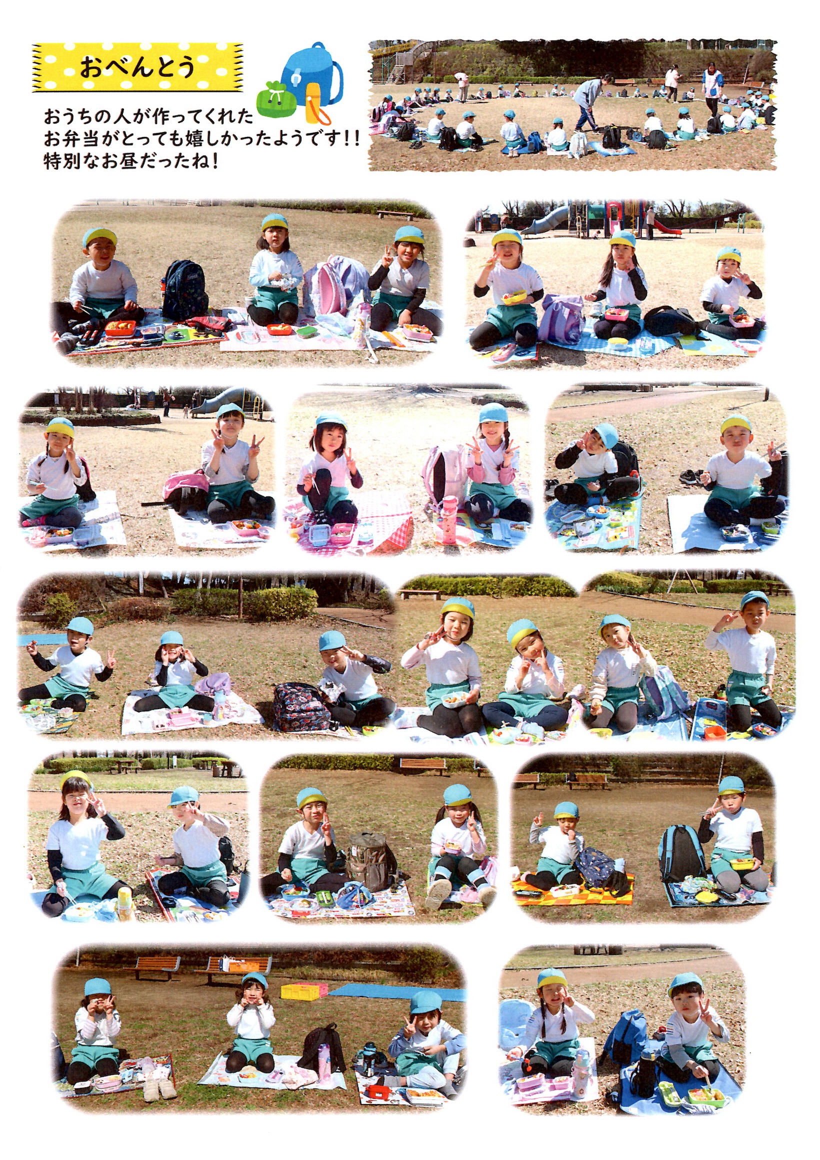 たくさん遊んだあとは、楽しみにしていたお弁当の時間です。シートを広げて、「見て見て!」「おいしいね!」と会話も弾み、お家の方に作っていただいたお弁当を嬉しそうに頬張っていました。