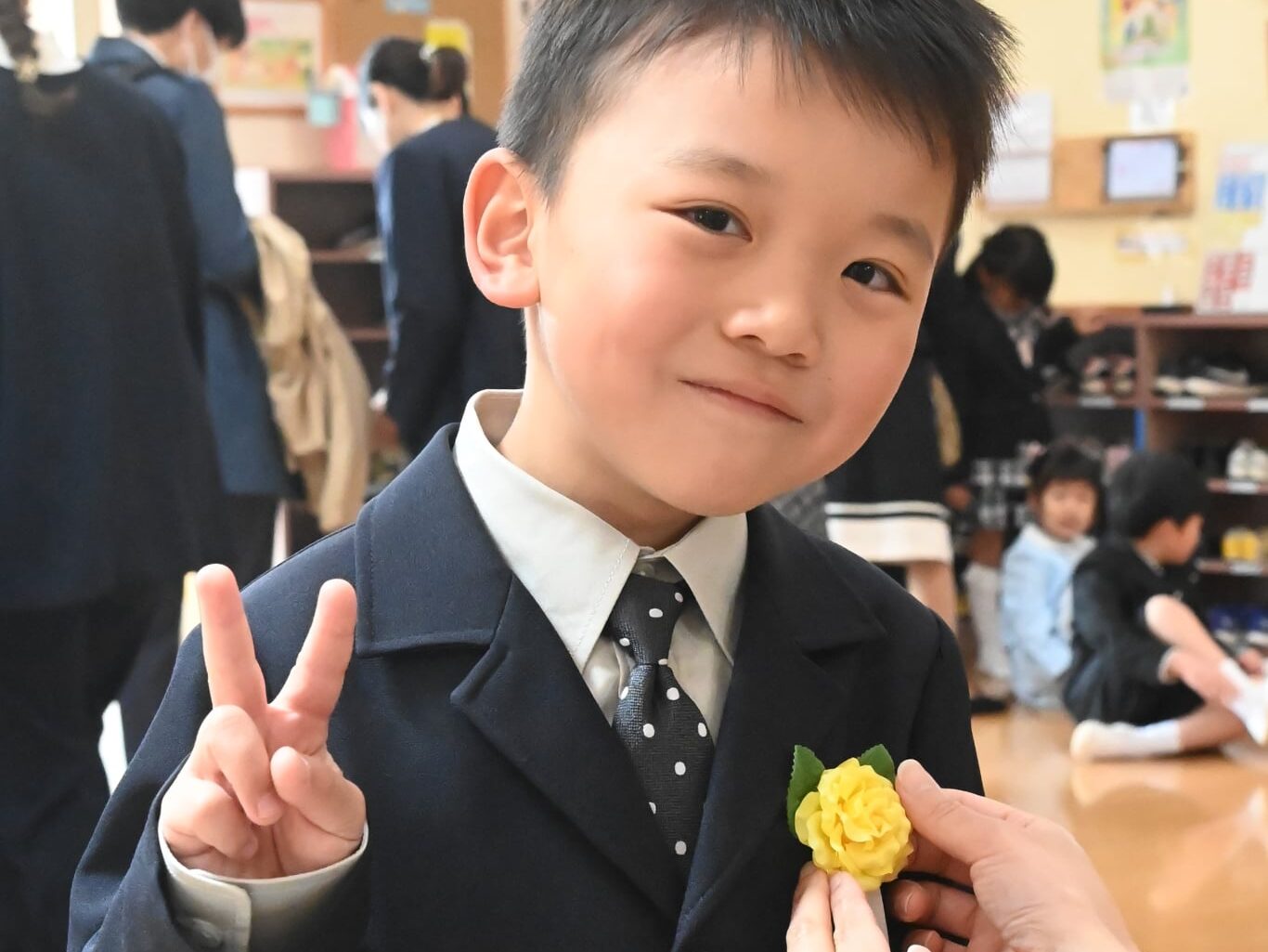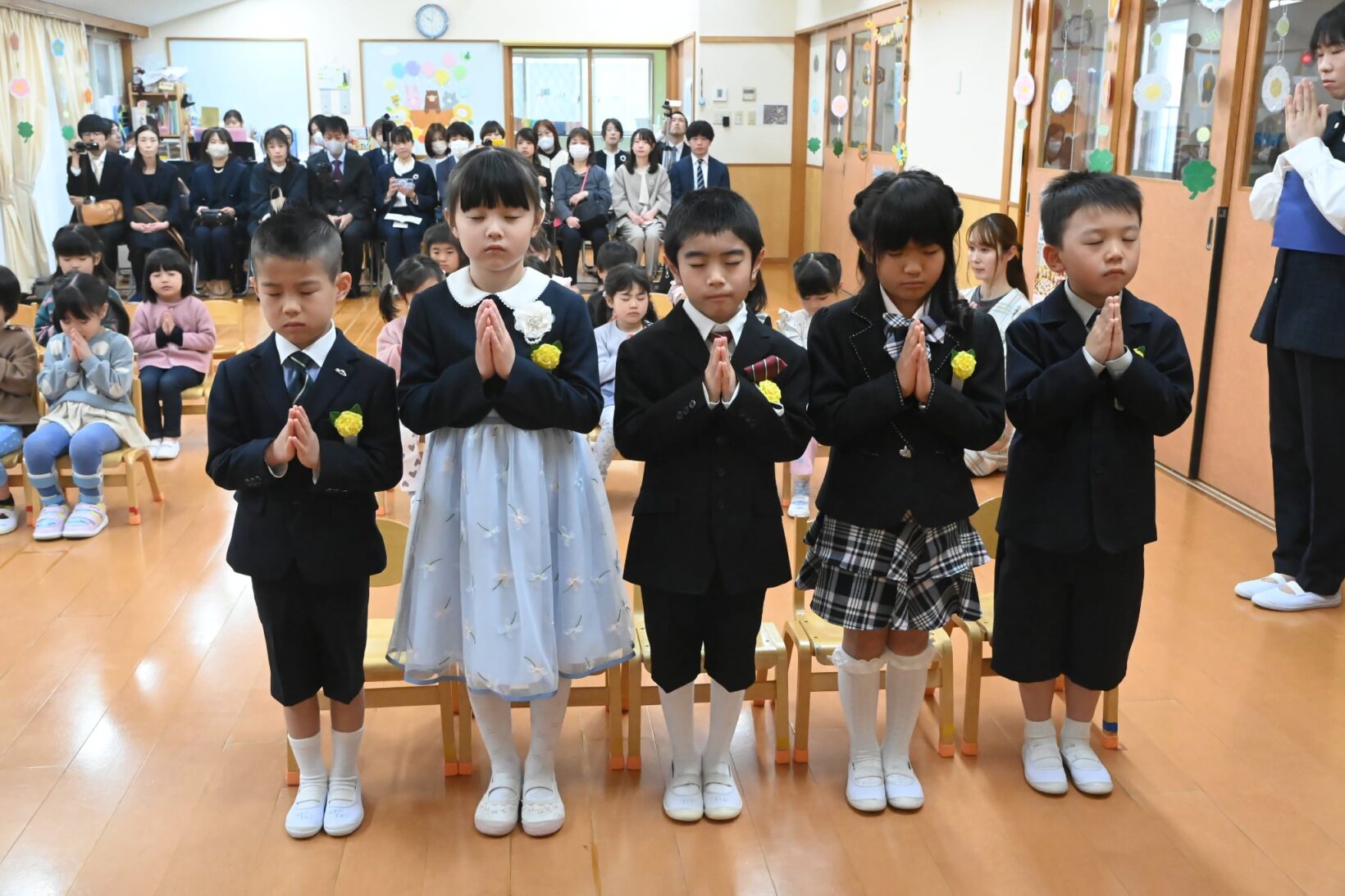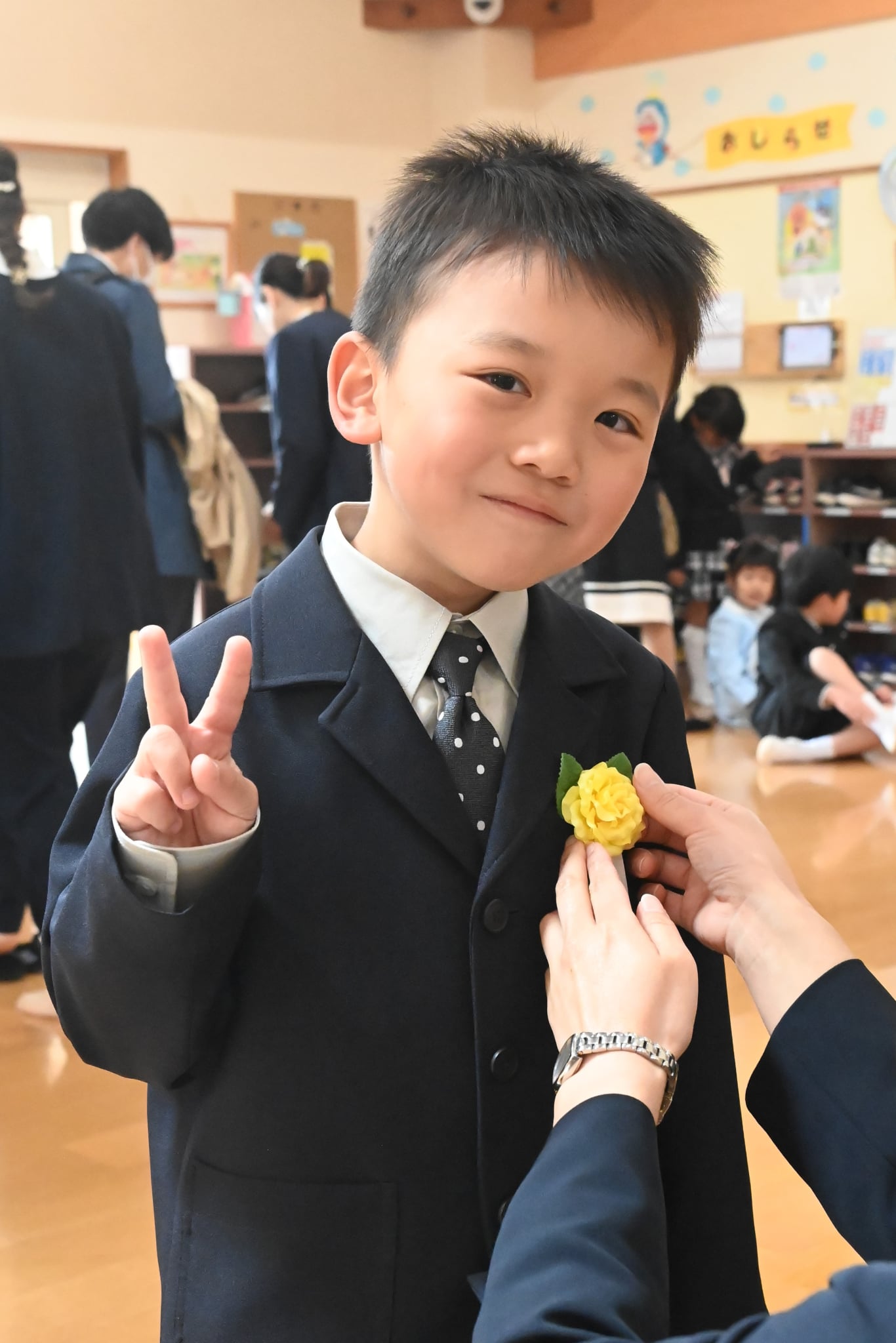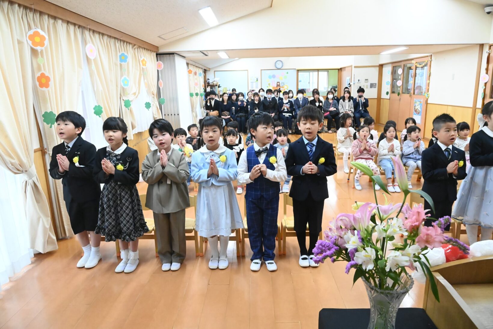 卒園児は、先生から素敵なお洋服の胸にお花をつけてもらい、少し緊張しながらも誇らしげな表情で式に参加しました。式では、仏様の教えである「命を大切にする人間となろう」をみんなで斉唱し、心をひとつにする厳かな時間となりました。