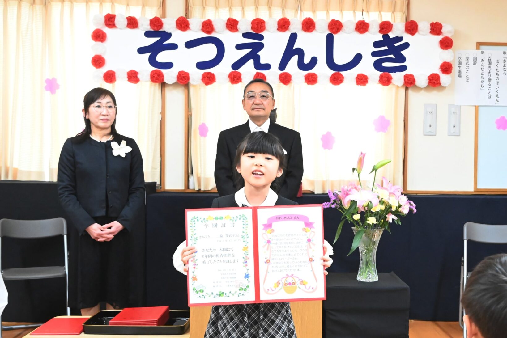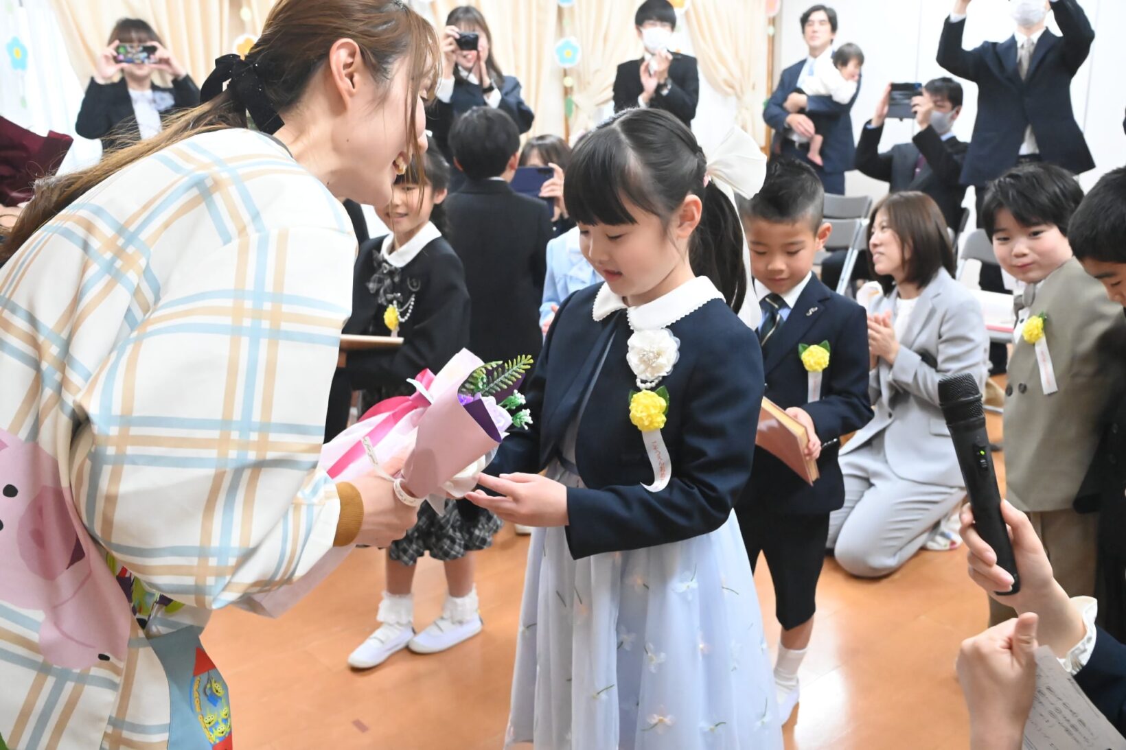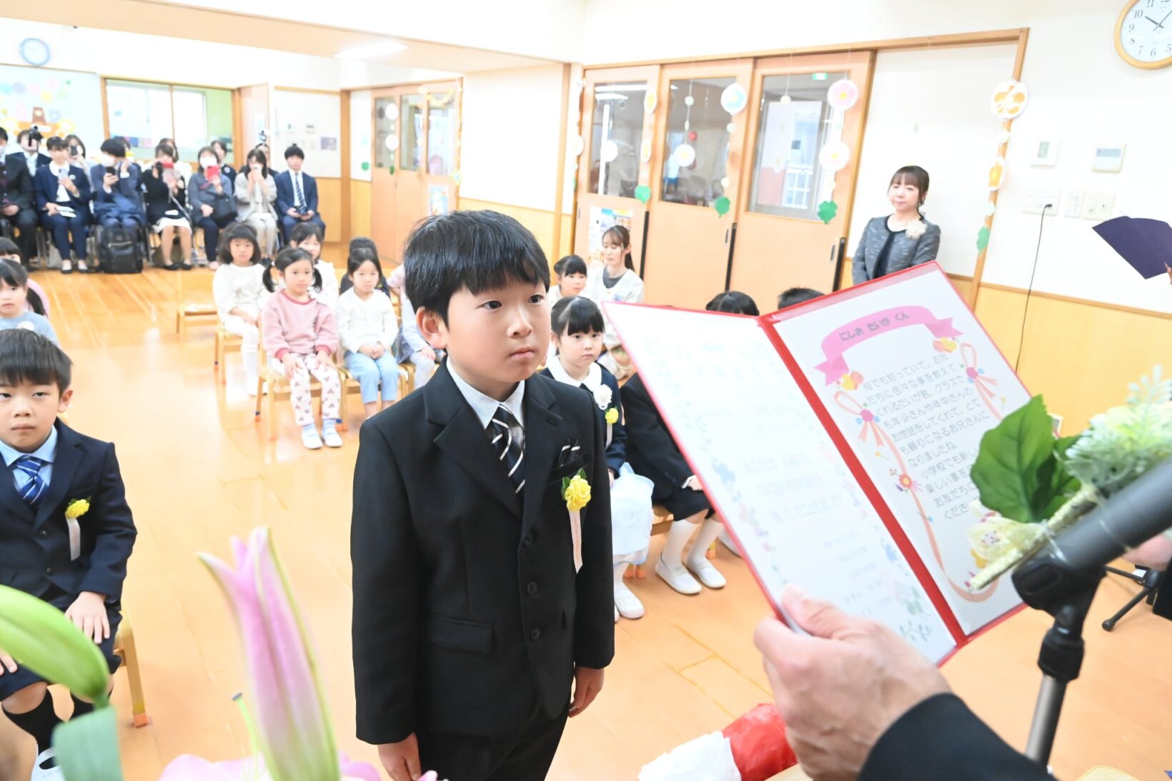 保護者の皆さまに見守られる中、一人ひとりが立派な姿で卒園証書を受け取りました。その後は、「どこの小学校に行くのか」「大きくなったらなりたい夢」を自分の言葉で発表し、成長した姿に大きな拍手が送られました。