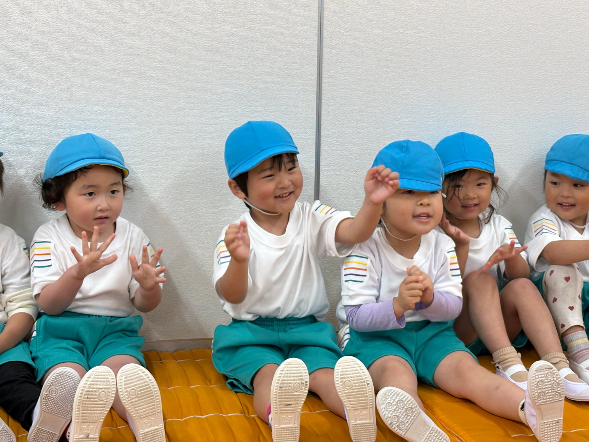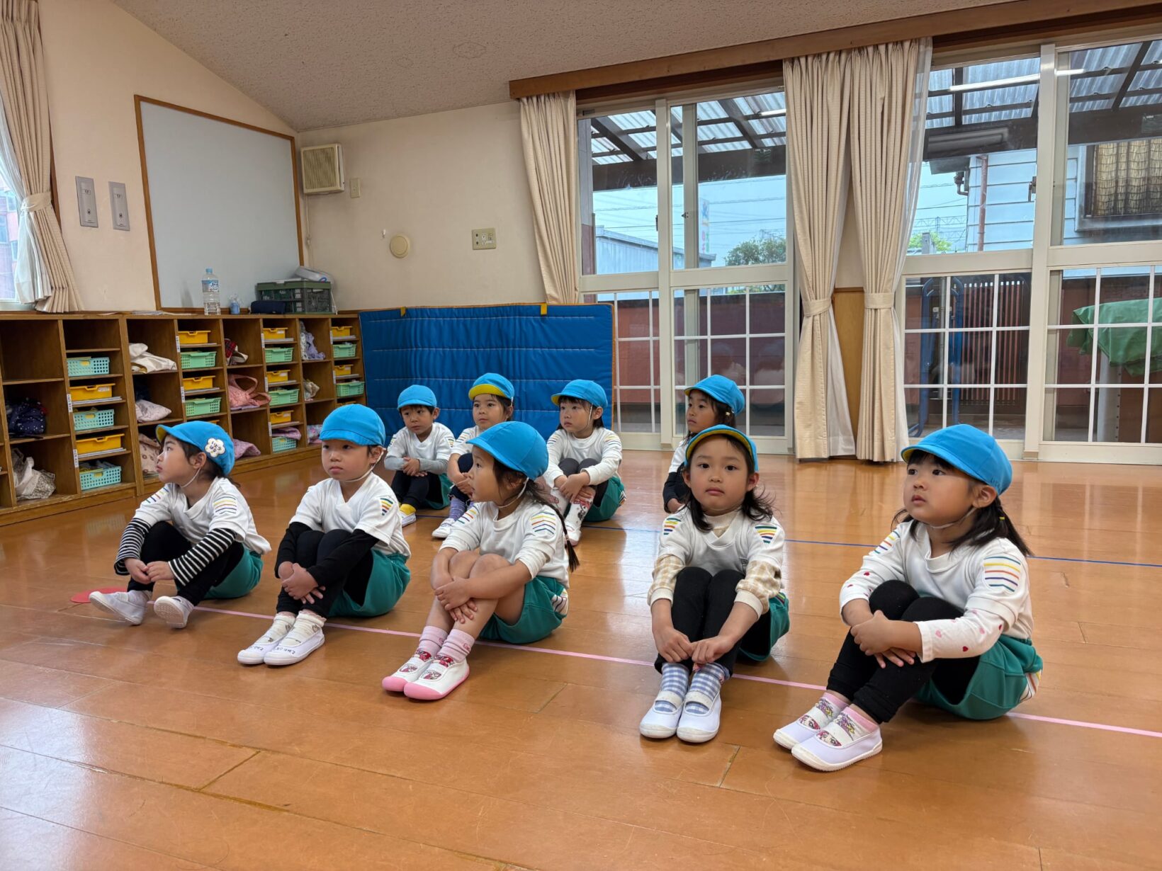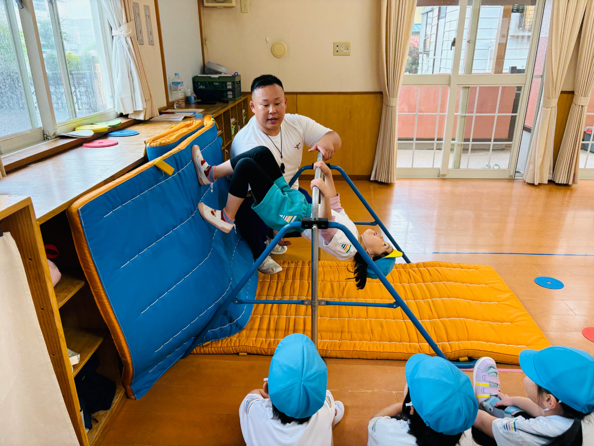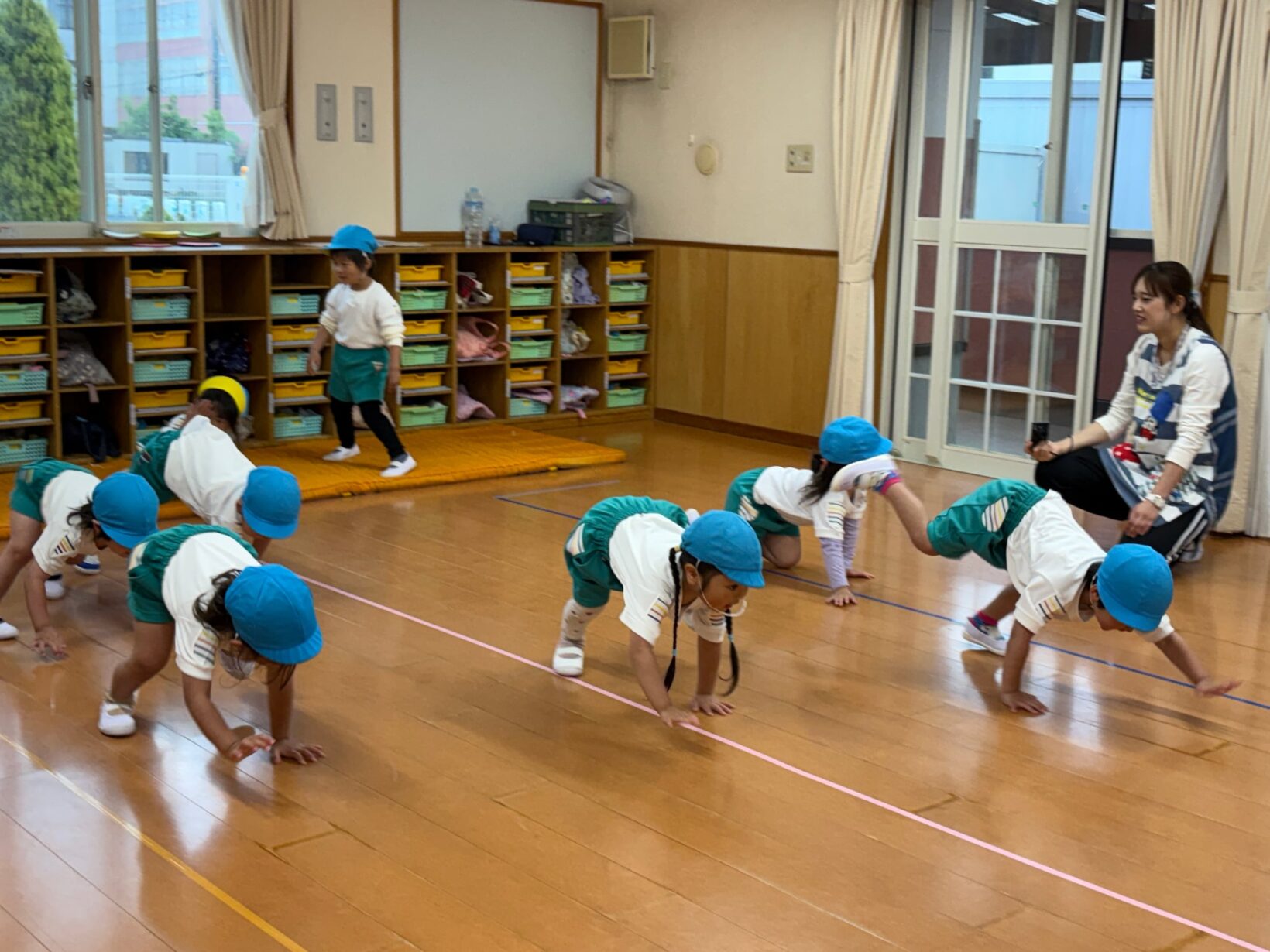 今日はあいにくの雨だったため、室内でマット運動や鉄棒を使い、年齢に合わせた運動を楽しみました。うさぎやクマさん、ペンギン歩きしたり(年少)、マットの上ででんぐり返しをたり(年中)、鉄棒で逆上がりの練習をしたり(年長)、「できた!」「もう一回やりたい!」という元気な声がたくさん聞こえてきました。